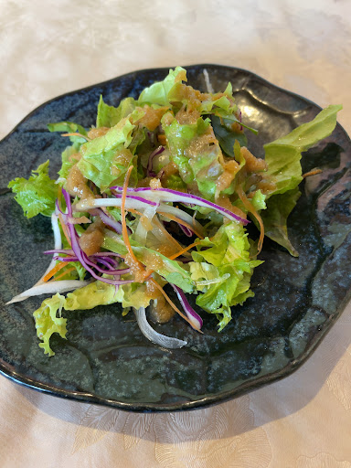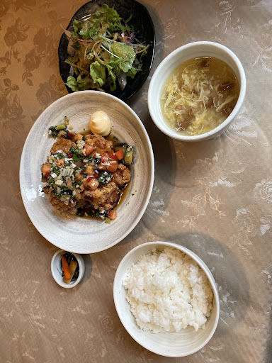 Read more「中華レストランTIDA」は以前から気になっていた中華レストラン。店の雰囲気からして、中国人経営者の中国料理店でなく、町中華でもないお店。 若い夫婦で経営されているようで、奥さんの応対は優しく丁寧で、とても気持ち良い。店内も明るく清潔感がある。お水はセルフサービスだが、熱いジャスミンティも用意されている。 ランチは週替わり3種類(野菜そば・油淋鶏・豚バラ厚揚げの煮込み)と坦々麺、鶏そばの計5種類がある。さらに、サイズが1人前サイズとハーフサイズがあり、ハーフサイズはメイン料理が半分だが、もう一品小皿とデザートが付くようだ。 私の注文は週替りランチ「油淋鶏」(1,080円税込)、1人前サイズ。 サラダがすぐに運ばれてきた。サラダを食べて待っていると、「油淋鶏」がスープ(なめこ卵スープ)と漬物、ご飯と一緒にやってきた。 なめこ卵スープ⁉︎なかなか珍しい。メインの「油淋鶏」も一般的な中華料理店の油淋鶏と違う。醤油ベースの香味ダレは、辣油や花椒などの麻辣は抑えている優しい味ながら複雑な味わいで美味しい。半分食べ終わったところで、自家製辣油を掛けると美味しさ倍増。私は辣油掛けの方が好みだ。 次回は口コミが高い「よだれ鷄」...
