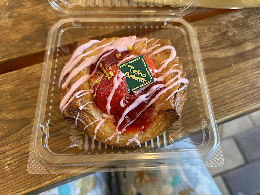 Insane. The platonic ideal of a bakery. Walked here from the Ghibli Museum and it was a perfect complement to that experience. There are so many choices, because literally everything is delicious and beautiful. I got a pork sandwich, an egg sando, a frosted cannele, a berry custard donut, a strawberry cream danish, and a whole loaf of coffee cream swirl bread; I ate both sandwiches and the danish in a frenzy (danish is pictured), and even after that, a part of me wondered if I should buy even more. I couldn't read any of the signs, and things were busy enough that I didn't want to hold up the flow of traffic by pulling out my phone to translate, but you really don't need to know what exactly everything is, because it will taste good regardless. The outside and interior are really charmingly decorated, and there's a constant stream of visitors, most of whom appear to be locals. There is also a couple of tables...