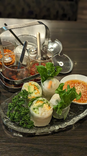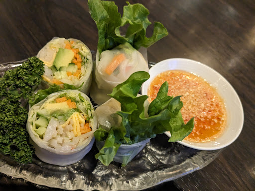 ・ポピヤソッドアボカド 海老と野菜アボカドの生春巻き ピーナッツ入りのスイートチリが甘辛く美味しさを引き立てていました。生春巻きは太めで具がたっぷり巻かれていました。