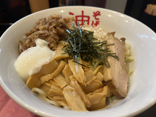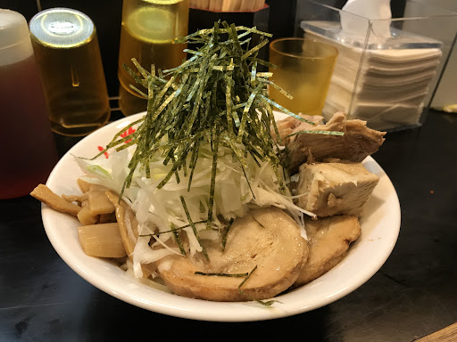This is an Abura Soba shop (no broth like in ramen, just slight amount of sauce at the bottom) with a ticket vending machine system. All items have descriptions in English with a photo, so there is definitely no issue about being able to make your order without Japanese. You add extra vinegar and chili oil, with extra chili paste (was quite spicy) and mix them. Ordered the large one that costs 1000 yens, did add the toppings and everything, mixed well but the flavor was just not there. Possibly was one of the harder meals to finish for me. I usually don’t leave any food behind, so I found myself cringing as I discovered more and more pork rolls beneath the noodles. Pork was not flavorful or soft enough, and the noddles didn’t have the right texture without any bite to them. The sauce in general lacked the balance. I’ve been to even better tasting chain stores, so while the serving is definitely huge, that doesn’t make up for the lack of flavor. Wouldn’t come back again. It gets crowded as well. I am surprised how popular this...