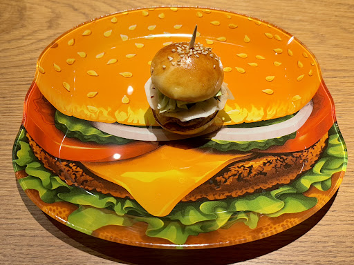 ⚪︎蓮根のきんぴらラムバーガー ハンバーガー柄のお皿にミニハンバーガーが乗って出てきました。ガブっといくときんぴらのサクっとした食感とラム肉の味なんですが、アレ?ラムが美味しい!?