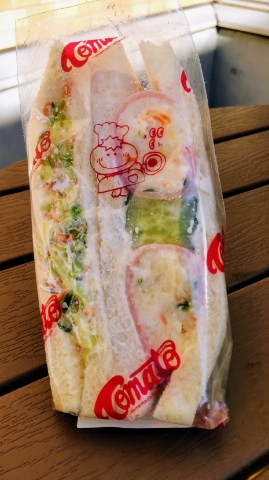 ■買ったもの 三種類で860円 フルーツサンド系を2つと総菜系を1つ。 しっとりしたパンで、フルーツサンドの生クリームが甘くないので、食べやすかったです。でも、子どもは甘い物を期待していたのか残してしまいました。