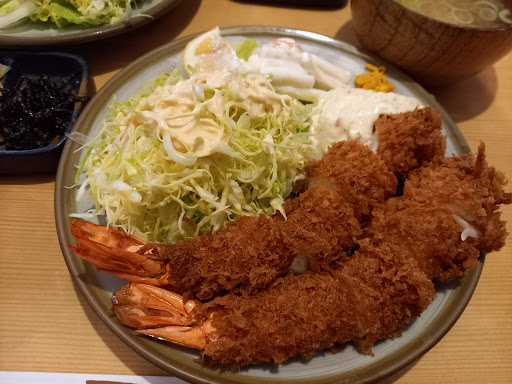 昼はカツがメイン。おろしポン酢のトンカツはサクサク衣とジューシーな肉が絶妙。立派なエビフライは立派で身が詰まっていて食べ応え抜群。50年の重みを感じる確かな味でした。