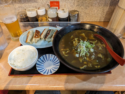 Read more大森駅からは徒歩10分くらい歩きます。TVでは駅から遠いお店として紹介されてましたがそれほど遠くありません。 土曜日19時過ぎ、先客は5名でした。カウンターに通されました。なお、調理場の前のカウンターと後ろにも小さいですが3名分のカウンター席があります。荷物置きのかごもあります。 ナポリ風ヤキソバにしようか迷ったのですが、カレーラーメンが小ライス付き、手作り餃子も人気ありということで、餃子にライス合わせることも考え、カレーラーメンと餃子を注文しました。後ノンアルコールビールも注文。 こちらのノンアルビールですが冷えたグラスをいただけました。これはGood。 カレーラーメンは和風テイスト。豚バラに玉ねぎ、少し甘めでスープがカレーと完全に一体化してるのでカレー南ばんといった感じです。小ライスでカレー丼にもできます。餃子は手作り感ありますね。 こちらのおかみさんが明るく元気に接客しておりました。とんとん焼きメンの説明などこちらの質問にも快く答えてくれました。ありがとうございます。次回訪問時はナポリ風ヤキソバ...
