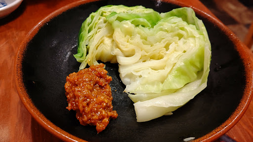 ✴︎とら八名物 肉みそ野菜盛り パリパリの生キャベツと違ってしっとりとした甘いキャベツ! 新鮮なキャベツをさっと茹でて甘みを引き出し、そのご後冷やしてシャキシャキ感をキープ! とら八名物の肉味噌!国産100%の牛・豚ひき肉に、にんにくや生姜など約十種類の素材を秘伝の配合でブレンド! 仕込みは全て職人が手作業でつくってるこだわりの肉味噌! キャベツと肉味噌の相性抜群!