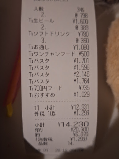 ビール@798×2=1,600円(切上げ) ソフトドリンク@389×2=780円(切上げ) 700円フードが735円(謎) 小計12,931円に外税10%1,293円 合計14,230円(切上げ)本当は14,223円