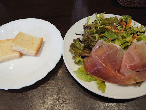 大き目にスライスされた生ハムと、ベビーリーフ等にオリーブオイルが掛かったサラダ。パンはお代わり出来ます。プリプリの海老に絶妙なアルデンテのパスタ。フォークで切れ軟らかい牛ホホ肉とレンコンの赤ワイン煮。どれもレベルが高いと思います。全体的に味付けは控え目で、食べやすく美味しかったです(๑´ڡ`๑)