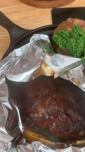 何度も来たことがあり、子どもや友人、そして私自身もとても美味しいと思っている鉄板焼きハンバーグとポテト。毎回必ず頼むセットです。アルミホイルに包まれて提供され、開けると湯気が立ち上り、肉厚のハンバーグはジューシーで食感も良いです。焼きじゃがいもはとてもホクホクで、北海道産かと思うほど。ソースやミートソースと一緒に食べると、じゃがいもが苦手な私でも丸ごと1個食べきれます。お店によると、長野県産のお米を使っていて、食感が柔らかいとのこと。多くの人が並ぶ人気のレストランです。
