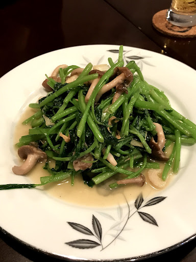 空芯菜のガーリック炒め: ニンニクがしっかり効いた味付けで食欲を掻き立てる。空芯菜も程よくシャキシャキで美味しい。