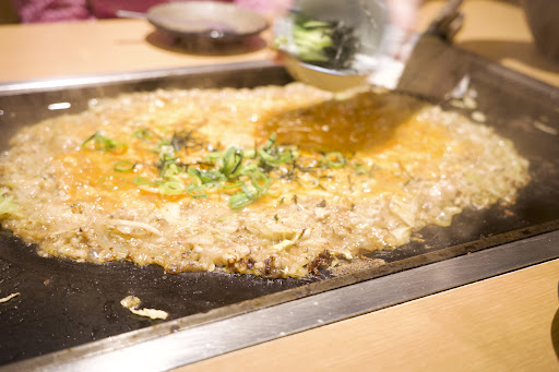 Chefs cook traditional Japanese food at your table. Each patron needs to order something to cook—meaning four people cannot go in, order one item, then share it. Each person needs to order something. The two of us ordered monja and okonomiyaki—both traditional Japanese.