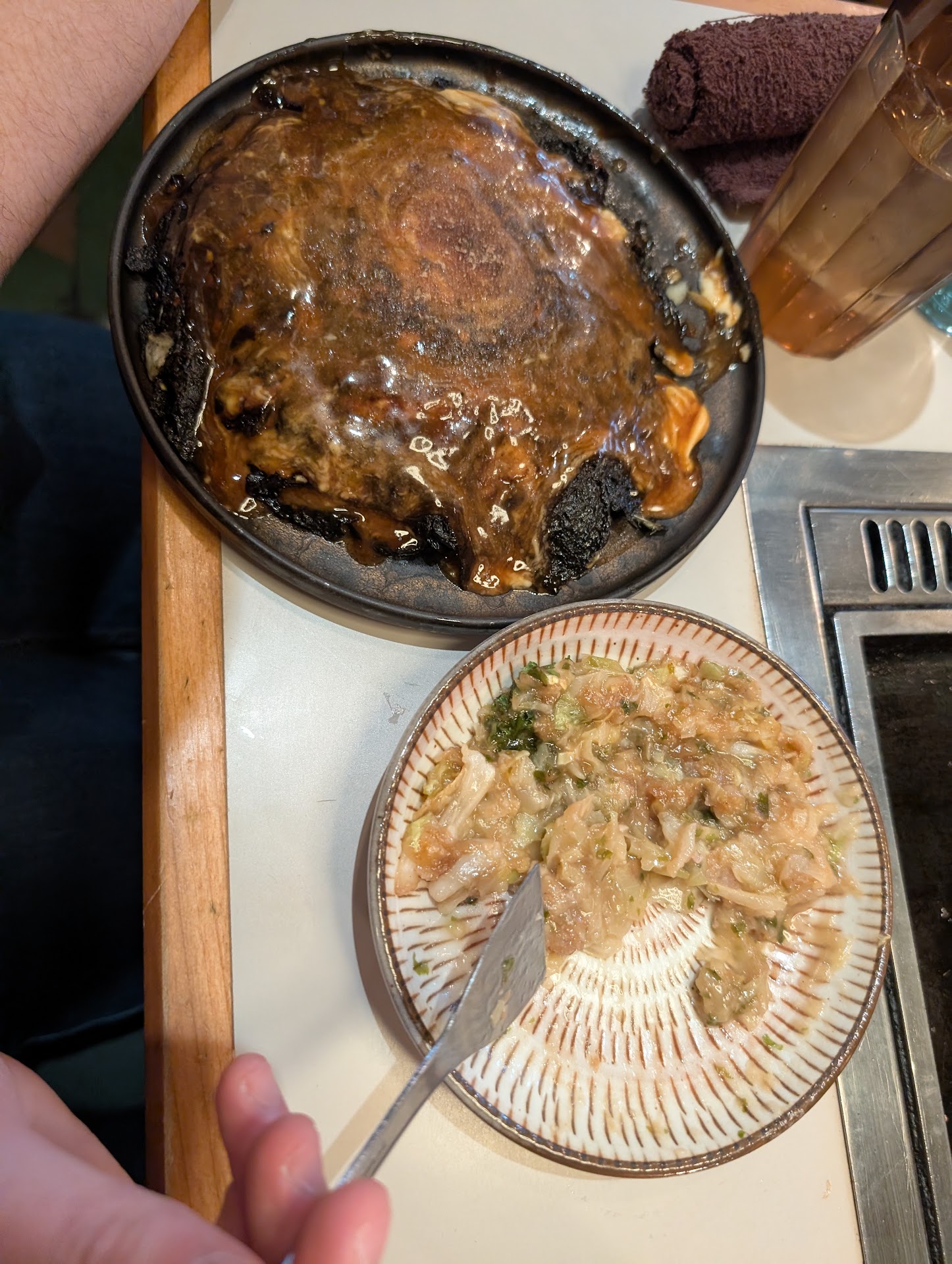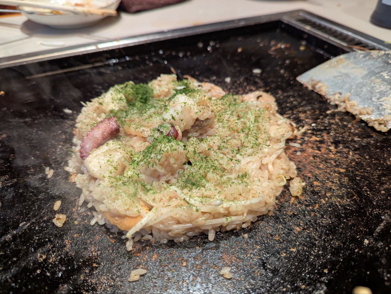 The first cook/waiter that came attempt to cook our food (I could not record the name since it is written in Japanese) added too much oil on the cooktop. This made the oil spatter everywhere when she poured the ingredients for the Okonomiyaki. The oil splattered and made stained my fatherâs jacket. The waiter who stained our clothes moved onto the next table after offering a napkin to clean it up. Follow that incident, that waiter never served us. We had to call a follow up waiter because we fail to get our remaining order after sitting for 20+ minutes. We dine there for about 1 hour and 20 minutes and had to follow up with them to cook our food. It seems normal that the staff puts the ingredients in front of us, then walks away? This is new to me.