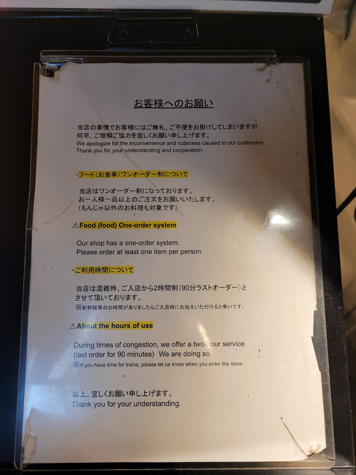 Read moreMy brother and I came here last night (Monday around 9pm). It was busy, but the wait time wasn't long for us. There's a queuing area with a line of chairs to the right side of the restaurant, and a staff member came by to let us view the menus when we were close to being seated. They have English menus available, and after you're taken to your table, you can put your bags and jackets in the compartment under the seats. (Definitely do this or your stuff will smell like food.) We ended up ordering a monjayaki, yakisoba, an okonomiyaki, and some drinks. We were able to finish all our food between the two of us, but I was extremely stuffed. The restaurant closed at 11pm: last order for food was 10pm, and last order for drinks was 10:30pm. You would need to go to the cashier at the front of the restaurant to pay the bill that the staff leaves at your table.