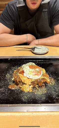 What we ordered (and loved) the 2nd time: Squid ink monja with cheese (so good we had to get it again) Pork, leek, & egg monja Okonomiyaki (pork & noodles - this okonomiyaki was made Hiroshima style, which focuses on layering the ingredients instead of mashing and mixing them together, and it was SO delicious. Apparently, it can be challenging to find Hiroshima-style okonomiyaki outside of Chลซgoku because most places serve Kansai-style, so we recommend this one a lot!) Lychee & condensed milk drink (again, so delicious we had to get another)