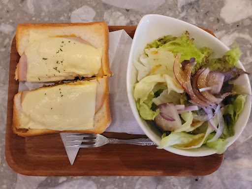* モーニング Bset(550円) キーマハムチーズトースト(+130円) オレンジジュース(+50) まずモーニングセットはA~Cの種類があります。 A:トースト/サラダ/温玉子/ドリンク(ブレンド,アメリカン,カフェオレ ホット,紅茶) B:トースト/サラダ/ドリンク(ブレンド,アメリカン,カフェオレ ホット,紅茶) C:トースト/ドリンク(ブレンド,アメリカン,カフェオレ ホット,紅茶) 上記のトーストに対して、プラス料金でアレンジができます。 +30円:ジャムトースト,メープルトースト +50円:チーズトースト +100円:ハムチーズトースト +130円:キーマハムチーズトースト さらに!お好みのドリンクへのアレンジも+50円で可能です。 ということで、Bセットに+130円でキーマハムチーズトースト、+50円でオレンジジュースにアレンジを加えさせていただきました。 キーマハムチーズトースト、もう朝からビールが飲みたくなる一品。いやいや、朝だからサイダーでもいいですね。とにかくシュワっとした飲み物と一緒に頂きたくなるパンチがしっかりあるメニューでした。 健康を気にする私にとって、このちょっとしたサラダも見逃せませんでした。
