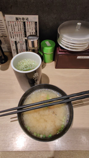 Vibe: 4/5. Located off the main drag in Shibuya, this sushi bar is a standing only restaurant that can serve around 8 diners at a time. The bar is cramped, so be prepared to wait and be up close to other diners during peak hours. The sushi chefs are located directly in front of you, so you can watch as they prepare each piece. Each counter "seat" is its own self-serve entity, providing diners with wasabi, soy sauce, utensils and a matcha jar w/ water tap right at their fingertips which is very convenient.