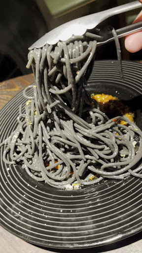 黒いボロネーゼ。見た目はイカ墨パスタ風だが、ソースが黒いのではなく、パスタ自体が黒いパスタで中細のアルデンテ。パスタの上には金箔があしらわれているが肝心なソースはパスタの下にたっぷりと敷き詰められていた。よく混ぜてくださいとのアドバイスで万遍なく絡めてから食べた。これもとても美味しい。素敵なメニューだ。