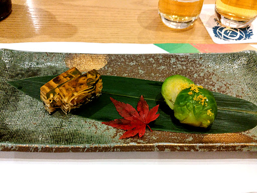 ①先付け :河豚皮煮凝り 芽キャベツ浸し 煮凝りは好物♪ 少し酸味が有る感じ。 芽キャベツが妙に美味しかったです~♪