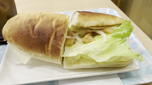 サンドけっこう大きめ レタス・サーモン・オニオンスライス・チーズの重ね コッペパンが カリ...