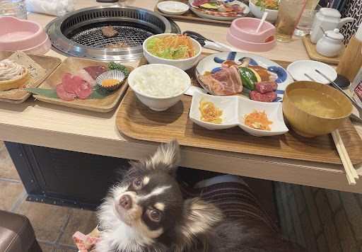 まず、わざわざ犬によくないネギタンをはじめに強制で出してきます。 食べ放題のコースを注文しましたが、最初に決まった肉やサラダを持ってくるので、食べ放題の注文はそれを食べてからということでした。その説明自体も注文時にはありませんでした。しかもその最初に持ってくる肉の中にわざわざネギのタレを塗ったタンがあって、「こちら、ネギのたれがかかっていまして、わんちゃんのお腹に入るとよくない云々」、「わんちゃんには最もよくないお肉になりますので、焼く場所を云々、、」というわかりきったことを得意げに説明されてまずイラっとしました。 焼き肉でネギタンは普通では?と思った方、私がここに書くに至った理由はここからです。なんと、この後食べ放題でタンを頼むと塩コショウなんですよ!だったらなんでわざわざネギタレ塗ってくんだよ!そもそも犬と一緒なんだから強制で出さずにネギなしを持ってくるか、こちらに選ばせるのが筋だろう? ていうか焼き肉でタンの塩とかネギとか選べないこともおかしいからね。