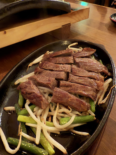 The food. Wow. We got the lean beef steak with vegetables underneath that came with 3 dipping sauces. The steak was cooked rare and to perfection and melted in your mouth. Even without the sauces, it was so delicious!