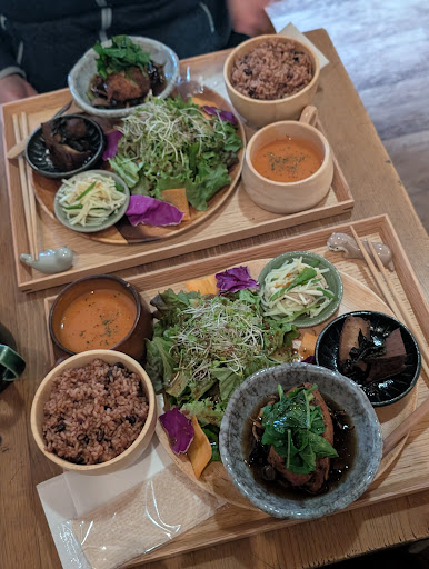 I love this place!! They have student discounts and a dog in the store!! He walks around waiting for pets and loves to sit with customers. The service is a bit slow because it's managed by two people, but if you're not in a rush, I HIGHLY recommend getting lunch or a midday coffee here. The food is all vegan and all delicious and fresh. The coffee is always delicious, and the service is extremely friendly. They offer English menus, as well! The interior blocks any windows to the street and the public, so being inside feels like an escape from reality for a little bit, and it's as if you're in a cafe in the forest just having a relaxing break. I love coming here by myself or with friends to study or just enjoy...