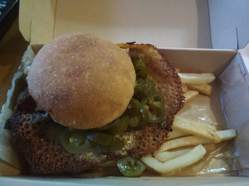 Funny name but but a great burger. Not a ton of options on the menu, which tells me they are just trying to do a few that are stellar. I got a pretty standard option, with mayo, lettuce, tomato, and cheese, and the bit of burnt cheese just added a level of texture that was unexpected. They didn’t have fries so I opted for onion rings and they were delicious. Small space, but...