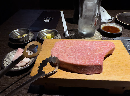 Read moreMy wife and I tried Yakiniku Panga on Sunday evening dinner. We didn't have a reservation, but they were able to accommodate us as their were plenty of empty tables. What confused me was why they seated us in the centre of the restaurant when there were empty tables by the panoramic glass with the view of the Asahi golden turd. Did we have to be muslim to get a table with a view? We chose the 6 premium A5 Wagyu set. Don't bother looking at their menu online because when you get there, they offer something different. The 2 best cuts of beef were grilled by the server at your table, the other 4 cuts you grill yourself. The server brings out a beautiful piece of marbled steak, grills it to perfection, and then places that cooked steak back on the tray that the raw steak was on to take the steak into the kithen to have it sliced. That's just bad food hygiene no matter where you're from. A different waiter brings back the steak sliced on a plate. Lucky we had a grill on our table to re-grill our contaminated steak. We even told the server my wife was pregnant, but clearly she didn't care. The steak was delicious even cooking the steak a little longer on the grill. The thin cut was next, it was tender and delicious with their egg/truffle sauce. I can't say the same for the remaining 4 cuts of beef we had, they were chewy and below A4. I really wanted to enjoy this place but I won't be back. Plenty of other good Wagyu...