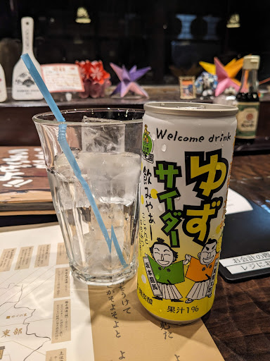 まず、飲み物は地酒と柑橘系のジュースが目を引き、ゆずサイダーとジンジャーエールを。 お通しのサラダに合わせる瓶入りソースは5種類から選べ、私は味噌を。量がたっぷりで味わい深く、わかっていてもスタートから期待大になります。