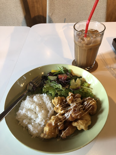 Read moreDelicious karage plate and giant coffee! Drink set is +100 yen, super filling and great deal. The cafe has a chill vibe but not super quiet. Single bar seating at the window, a few tables and couch seating available. Great spot for studying if you like some sort of background noise. The menu has some great options but not overly packed with stuff. The waffles look amazing and I want to try those next time I come. Staff was super nice and accommodating. New favorite cafe around...