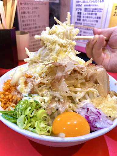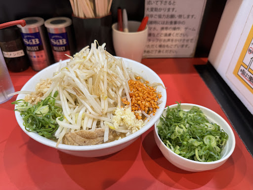 Read more2023/11/08 初訪問 GoogleMapでラーメンを調べてたらこのお店を見つけて二郎系だと知り訪問することにしました。二郎系は月イチで食べたくなる依存度が高くて不思議な魅力があるラーメンです。 12時ぴったりに訪問しました。大学近くで学生も多いから行列に並ぶ覚悟で行きましたが店前に行列はありませんでした。 店内にある券売機でチケットを買ってから並ぶシステムのようです。 店長さんにお店の奥へと案内されて進むと丸椅子が置いてあり、そこで待つようにとお願いされました。 丸椅子は3つあり、3人までは店内で待ち、それ以上になると店外で待つことになるようです。 買ったチケットには赤丸をしておく必要があります。説明もカウンター横に書いてあるので特に迷うようなことはありませんでした。 『ラーメン小200g』830円と『味玉』100円のチケットを買いました。 もう若くないので二郎系は小で充分です。 店内はカウンターのみで10席程度です。 水はセルフサービスで、側にスプーンと紙エプロンも置いてあるので必要であればそこで取ります。 待つこと10分程でカウンター席へ案内されてそこでさらに5分程待ってラーメンが提供されました。トータルで15〜17分は待ちました。 ただし、私が入店してから続々と客が来始めたたのでたまたま運が良かっただけかと思います。12時少し過ぎてから訪問すると間違いなく行列待ちになると思います。 脂は辛脂なるものを選択してのですが、これがラーメンをさらに美味しくしてくれました。 ラーメンのスープは二郎系と同じくクリーミーですがそこまで濃くはないためスイスイ飲めます。 麺は太麺平打でワシワシと噛みながら食べます。 味玉は燻製されていて香り強めなので燻製が苦手な方は注文しない方が良いです。 チャーシューはホロホロと噛まずに崩れて甘みがあります。 野菜はもやし多めでシャキシャキでした。 目の前にある丼の中身をひたすら食べる豚となりきり、食事を終えました。さすがにスープは飲み干せなかったです。 次回時間に余裕がある時にまぜそばを食べたいと思い...