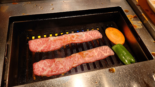 Offal & Wagyu beef grilled at the table at a lively yakiniku BBQ spot with photo-covered walls.