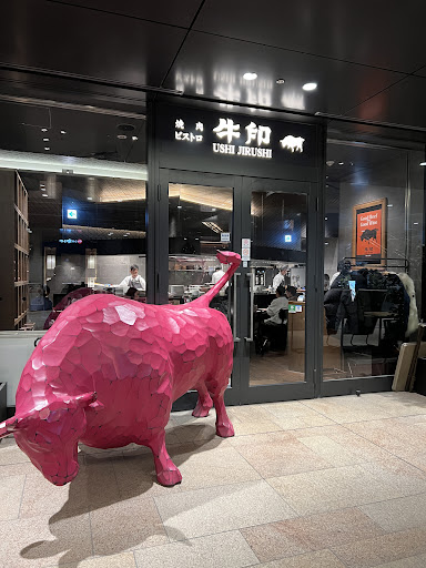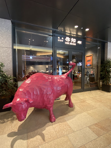 この日は嫁との焼肉デート。 東京駅八重洲口からもほど近い京橋駅直結の『京橋エドグラン』のB1Fにあります。 B1Fといっても吹き抜けのフロアになっているので開放感ありますね。 お店の入口にはピンクの牛の像がありなかなかのインパクトです。 店内は黒を基調としたお洒落な内装でソファ席もありイイ意味で焼肉店っぽくなく、たしかにビストロ然とした雰囲気です。