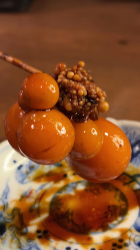 ⚫︎ちょうちん(希少部位) まばゆいゴールデンボールぶらぶらと✨ 卵になる前の未成熟卵。これだけ卵が何個もぷりぷりぶら下がりは初めて見ました! 50年継ぎ足しのタレで焼き、大小様々な卵。一気に口に入れたら、パチリ濃厚な卵黄が流れました❗️