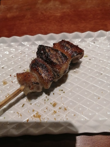 ♦︎ 胸肉のボッタルガ ボッタルガとはイタリアのカラスミ ジューシーな胸肉にカラスミたっぷり❣️ 醤油パウダー、ジョロキアオイル 贅沢な一串です。