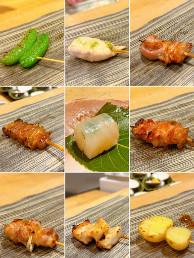 -ささみ -アスパラ -カブサラダ -鶏のスープ -せせり -かわ -はつ -蛤のもち粉揚げ -わさび菜 -やげん -スナップえんどう -背肝 -鯛の桜鮨 -砂肝 -ちょうちん -ピーマン -レバー -カニクリームコロッケ -ジャガイモ -むね -うずら -つくね -〆のご飯 -海苔の赤出汁 -黒糖シャーベット