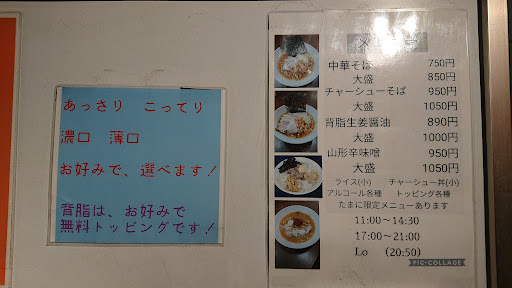 場所は、東武スカイツリーライン「竹ノ塚駅」より徒歩約13分。ご夫婦で切り盛りしており、今では食べログTOP5000に選出される店。 店内は、厨房を囲むL字型カウンター11席のみ。 卓上調味料には七味唐辛子、胡椒。 卓上の掲示によると玉ねぎ・背脂トッピングがオススメ。