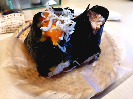 I'm not sure what was going on but it seemed like they had two stores on opposite corners from each other. Either way I lined up just before their second shift at 4:30 and only two groups were in front of me. The way they have it set up is you go in, order, and wait outside until they call your number with your order. While you wait there are a few seats and a bench to sit on, but the store is just big enough to let maybe 5 people stand inside while leaving space for people to walk by. I actually like this because there is no sit down as far as I could tell, which means orders go out fast and people get their onigiri quickly. All of the workers there are very nice and help you even if you can't speak Japanese. They have an English menu in store and on their social media to help as well. The taste of the onigiri is quite good and they cater to a more spicy set of toppings which I actually love. They seem to be going for a more Korean style flavor while still keeping traditional Japanese options. I ordered their new addition, a spicy garlic shrimp, and it was excellent. The only thing I'd change is to mince the shrimp up a bit more so you can get a little in every bite. As it is now they use whole baby/small shrimp with nicely sliced garlic. I also ordered their karaage mayo and Korean chicken. Both were nicely balanced while keeping the proper taste of chicken instead of being overpowering with sauce or breading. The portions were big and 3 should do the average westerner just fine, but these keep well enough you could order for lunch and dinner. (which is what I did) I would be coming back here every day if I wasn't busy trying to eat my way through everything...