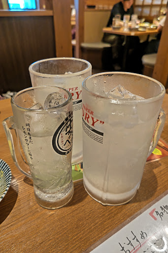 ●ドリンク:定番のレモンサワー(218円税込)をリピートオーダーしてましたがオーダーの手間を考え、筋トレジョッキ(658円税込)に切り替えました→1Lは入ってるかと思います。酔も回ってきた方や女性は気を付けて持ってください本当に重いです。※写真参照ください
