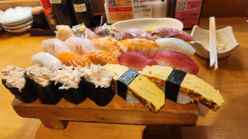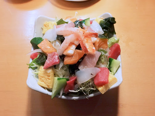 「海鮮サラダハーフ」:549円(税込、以下同) 味3.2点/CP3.6点 ネタは甘えび・蒸しエビ・鮪赤身・サーモン・はまち・イカ・玉子。野菜としてはキャベツ・わかめ・リーフレタス・玉ねぎ・きゅうりが使われていました。イタリアンドレッシングがかけられているのですが、ドレッシング控えめなのも好みです。ハーフサイズでも量は結構多めです。ネタの中では鮪赤身がまぁまぁ美味しかった。サーモン・イカ・はまちの「刺盛3点」が769円なので、「海鮮サラダ」の方がお得感があるように思います。