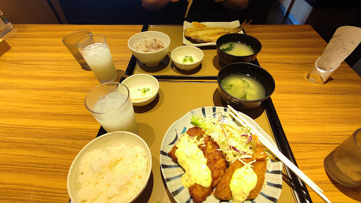 We ate here twice, once for lunch and once for dinner. The food is ok, good enough to come here again when the close by conveyor sushi dinner we initially planned turned out to be horrible 😅 For foreigners that haven't been in a similar place before, here are some explanations so that you don't feel too out of your depth. Make sure to use the vertical metal bar on the door as a handle before you push yourself into the door (I saw someone doing this wrong more than once). Ordering takes place at the table by using a tablet that has English menu. You can lift the tablet from the support and pass it around to everyone at the table for them to use comfortably, no need to lean over the table. When you enter the restaurant, don't try to order from the machines at the entrance. Those are the self checkout machines where you scan your bill's bar code for payment at the end of the meal. The waitress will bring you the order and she will slip the bill in the plastic ring that's at the end of the table. Don't move the plastic ring somewhere where she can't easily see it or access it. Payment can be done by card. There are unlimited free: cold water, pickles, dashi and rice refills you can serve yourself from, in the same area at the back of the room. Be mindful of not bumping into other customers that are queuing for refills or the waitresses that might need to pass by you with the trays. The glasses for the water are in the crates underneath the water dispenser. If the first crate you pull out is empty, there are more crates underneath, so don't give up 😅 To get the water, place the glass under the tap and push it back with a bit of force against the metal trigger. To get a rice refill, place your empty rice bowl in the middle of the rice dispenser and choose a size from the buttons on top. The rightmost button is the largest size portion (have not tried it), the middle right is a very decent size that's similar to the initial rice portion the waitress brings. I tried the middle left button in another location and it was less than half a bowl. Never tried the smallest size. For the pickles, they are on the left most side of the counter. There are small dishes stacked behind or on top of the container, I can't remember precisely. Use clean tongs that are hanged next to the container. Do not pick up tongs from the water container to get your pickles as those are used tongs! 😅 I think it might also be ok to put the pickles straight on top of your refilled bowl of rice as it's not unhygienic. Drop the used tongs into the water container in front of the pickle container. Do not put the used tongs back on the hanger. For the dashi... I have no idea as I didn't use it and I'm not so sure what it's used for in this setting😅 The staff is very kind and they will greet you loudly when you come in and say goodbye to you loudly...