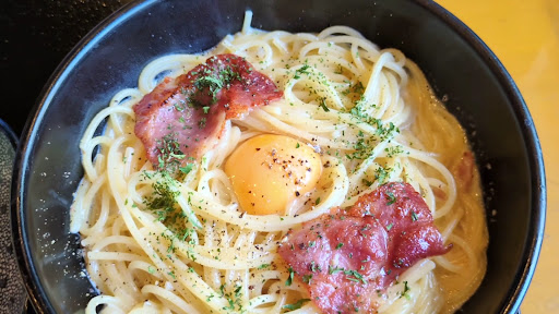 「カマンベールチーズとカリカリベーコンのカルボナーラ」は、豚肉とペコリーノチーズではなく、クリームソースとベーコンといった日本様式に、チーズをカマンベールチーズに置き換えたもののようで、さらに生の卵黄が落としてあり、日本では馴染みのある味わいです。 固過ぎず、柔らかくなり過ぎず、絶妙な弾力とソースを絡める水分量のスパゲッティーは、それ自体に小麦の味わいがありつつ、どんなソースも受け止める許容力(汎用性)があります。
