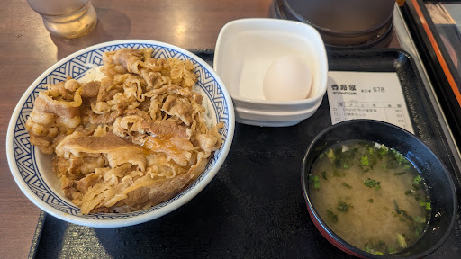 牛丼並に薬味と卵を入れ、肉を食む。こんな味だったっけ?と思わせられる肉質。ゴリゴリしてるとか、豚バラみたいな脂身が残ってるとか、味が染みてないとか。兎に角、肉が硬い。そして米が立ってない。ベチャっとしてる。古米か古々米か。正直、不味い。刻んでハンバーグにするべき低品質肉と、ドリアかリゾットにするべき低品質米のセット。