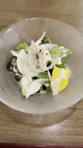 比較的すぐにまずは季節野菜のサラダが運ばれました♪ レタス、ブロッコリー、キュウリ、玉ねぎ!ゴボウ、れんこん、カブ、プチトマト、柔らかいポテト、マスタードとビネガーとたっぷりで、よく冷えていて、ドレッシングもビネガーがよく効いて美味しかったですね♪