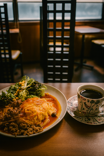 Read moreThis cafe felt like stepping into a quiet, retro hideaway. Their Omurice with demi-glace sauce was hearty and comforting, with the fluffy omelet draped over rice and a rich, tangy demi-glace that tied everything together. The side salad with corn added a refreshing touch, balancing the dish’s warmth. Alongside it, the dark roast black coffee was bold and aromatic, with a satisfying bitterness that paired beautifully with the savory omurice. The coffee cup itself, with its floral bird design, added to the...