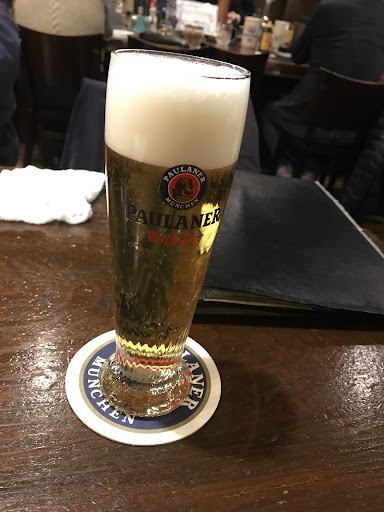 Sausages, sauerkraut & schnitzel served with German beers in a pub with wooden decor & a long bar.
