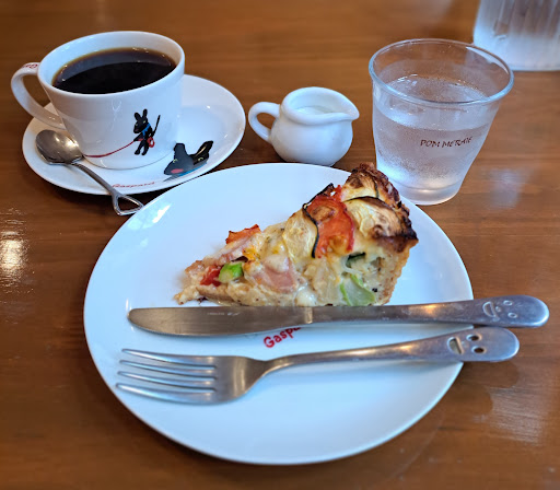 「夏野菜のキッシュ」と「ブレンドコーヒー」を注文。 キッシュはズッキーニやトマト、コーン、アスパラ等がたっぷり。 柔らかいアパレイユは私の好み。 優しい味わいで、とても美味しかったです。 コーヒーも豆から挽いているので、香りが良く、酸味のないキリッとした苦味の美味しいコーヒーでした。