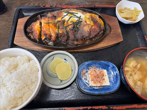 今日は特製カツ丼をいただいきました。カツ丼というけど、カツとご飯は別です。 熱々鉄板でカツ煮が出てきました。ずぅ〜っと熱々です。濃い目の味付けでご飯が進みます。 このセットで750円はお安い! 11時から15時の営業で、日曜と月曜がお休みとのことです。(2021/4:再訪)