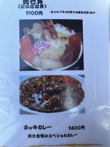 地元民にも観光客にも人気のお店です。お昼時には混み合います。11時開店のところ今日は11時30分くらいにやってきました。本日第一号の客のようでしたが食べ終わる頃、12時前には続々とお客さんが来店してきましたのでお早めの来店がよろしいかと思います。 有名人や芸能人も来店しているようです。ももクロのサイン、写真もありました。 ここの人気はやはり海鮮丼定食の店名の入った弍七丼(にいなな丼)定食 1,200円(税別)、あるいは海鮮丼と苫小牧名物とされているホッキカレーのハーフ&ハーフ 1,400円(税別)でしょうか。 本日は弍七丼定食をいただきました。ちょっと小さめなカンジの海鮮丼と小鉢類が付いた定食です。 海鮮丼は特筆すべきことはないですかね。こんなもんでしょうかね。ここら辺というか北海道ならドコでもコレくらいは出てくるでしょうね。器の丼は径が小さ目で深目なので食べづらいと感じました。弍七丼...