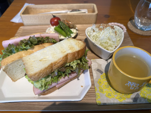 全てのお食事にサラダとスープ付き、飲み物は別です。 厚切りトーストのハムチーズ(880円)を注文しましたが、 とってもボリューミーで満腹に。 トーストは程よくカリッとしておりフワフワで美味しい!! ハム、チーズ、レタスのバランスもよく 最後まで美味しくかぶりついて食べました笑
