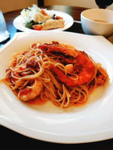 Read more「シーフードのトマトパスタ」のセットをいただきました。 (スープ・サラダ・ドリンク付き) トマトの酸味と甘さが引き立つタイプのトマトソースでした。 エビとあさりの多さに感動しました。有頭エビは手で剥かないといけないけど、ぷりぷりフワフワで、とても美味しかったです。